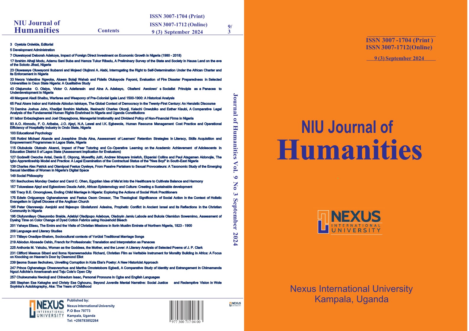 This edition of NIU Journal of Humanities touches on Development Administration, Educational Psychology, Social Philosophy as well as Language and Literary Studies.