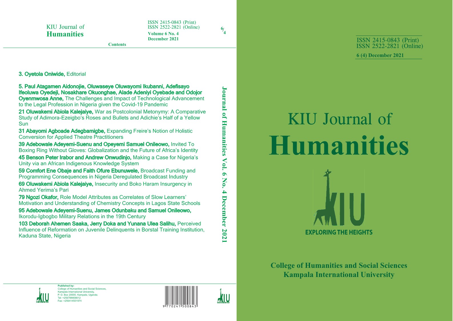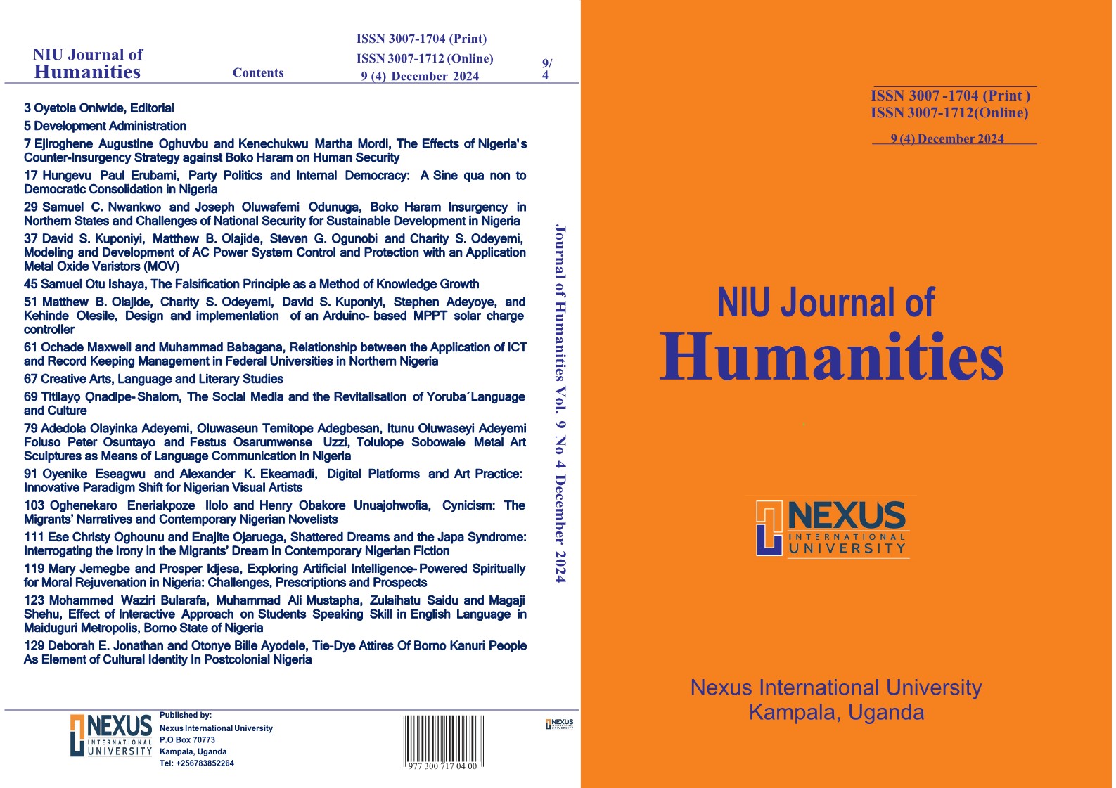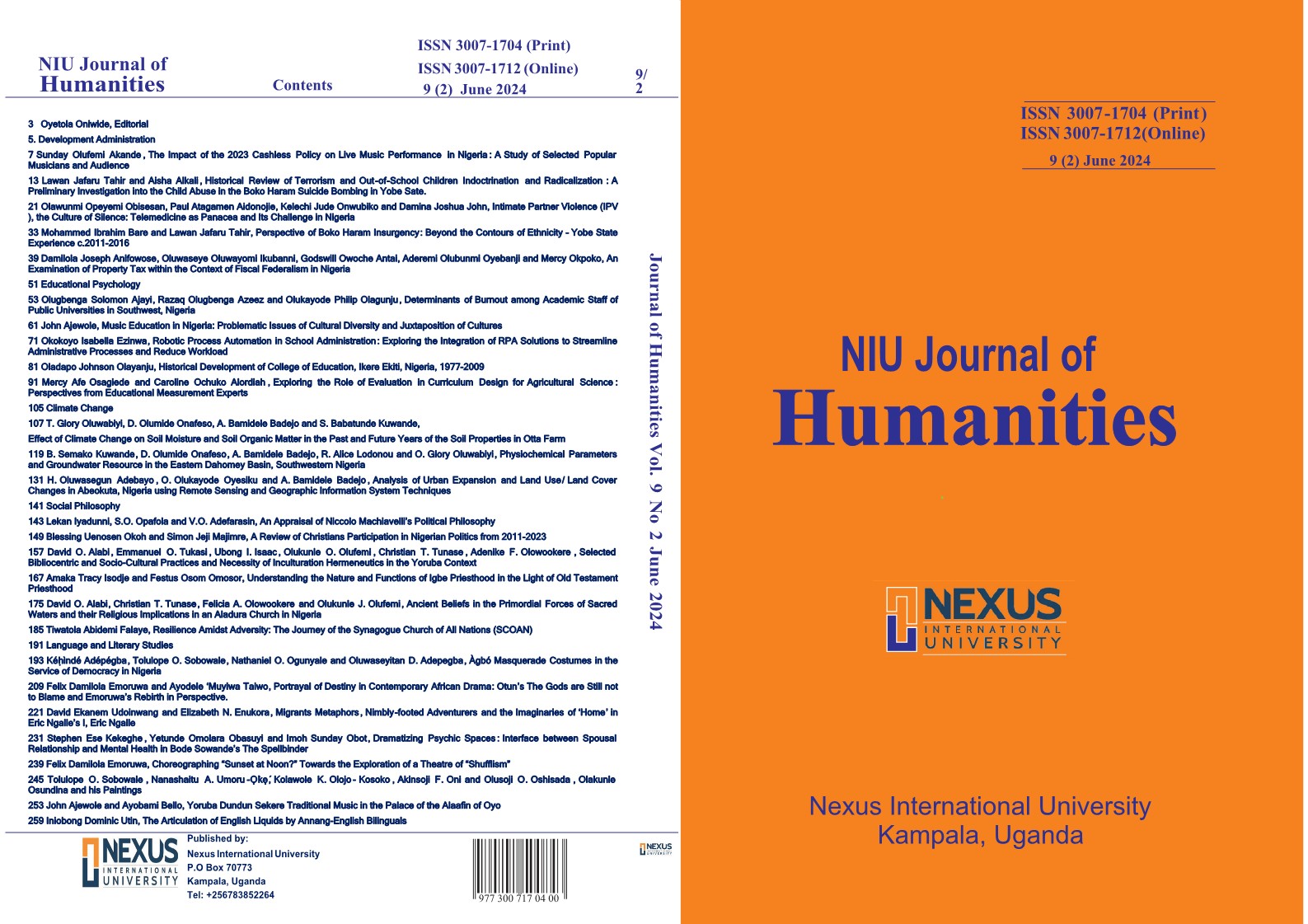 This edition of KIU Journal of Humanities touches on Development Administration, Social Psychology, Religious Studies, Communication Arts and Literary Studies, as well as Educational Management and Educational Technology.