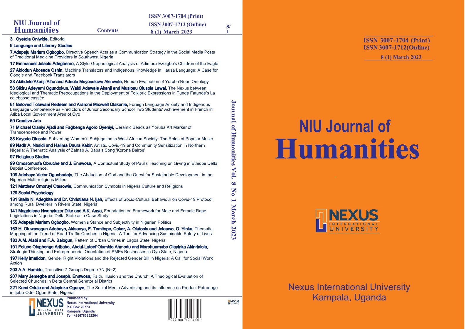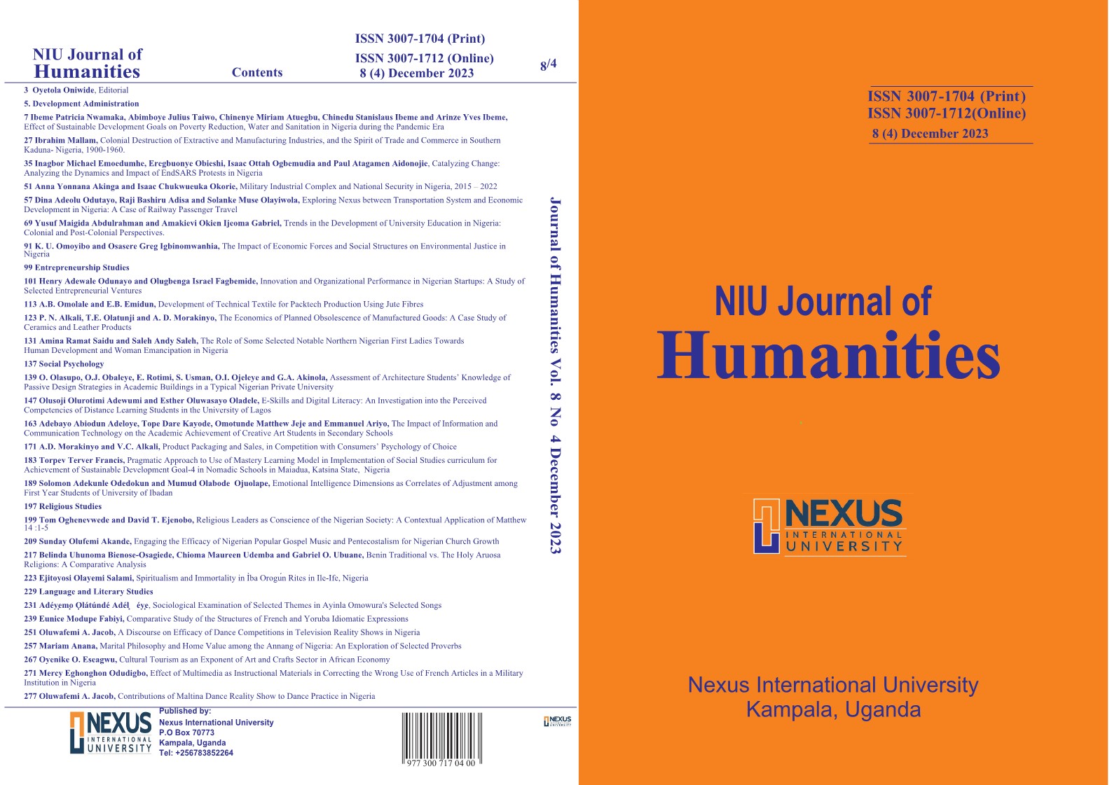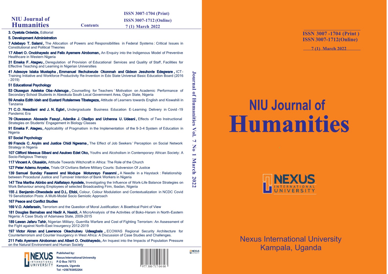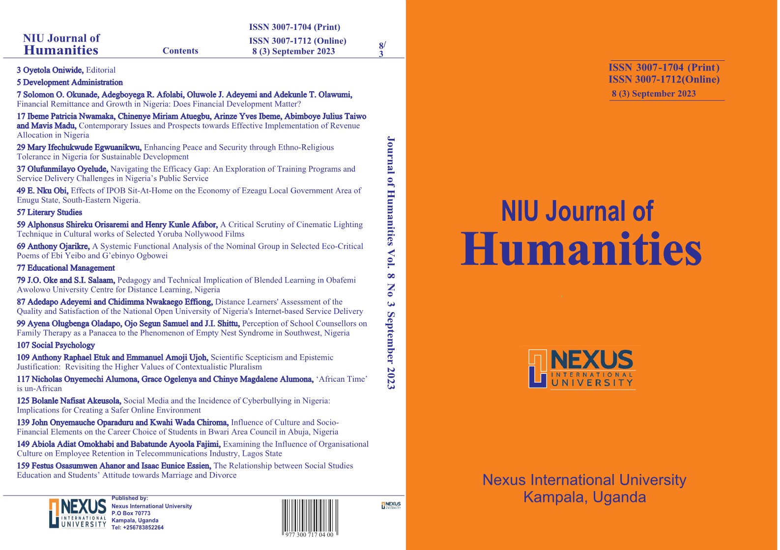 This edition of KIU Journal of Humanities touches on Development Administration, Social Psychology, Religious Studies, Communication Arts and Literary Studies, as well as Educational Management and Educational Technology.