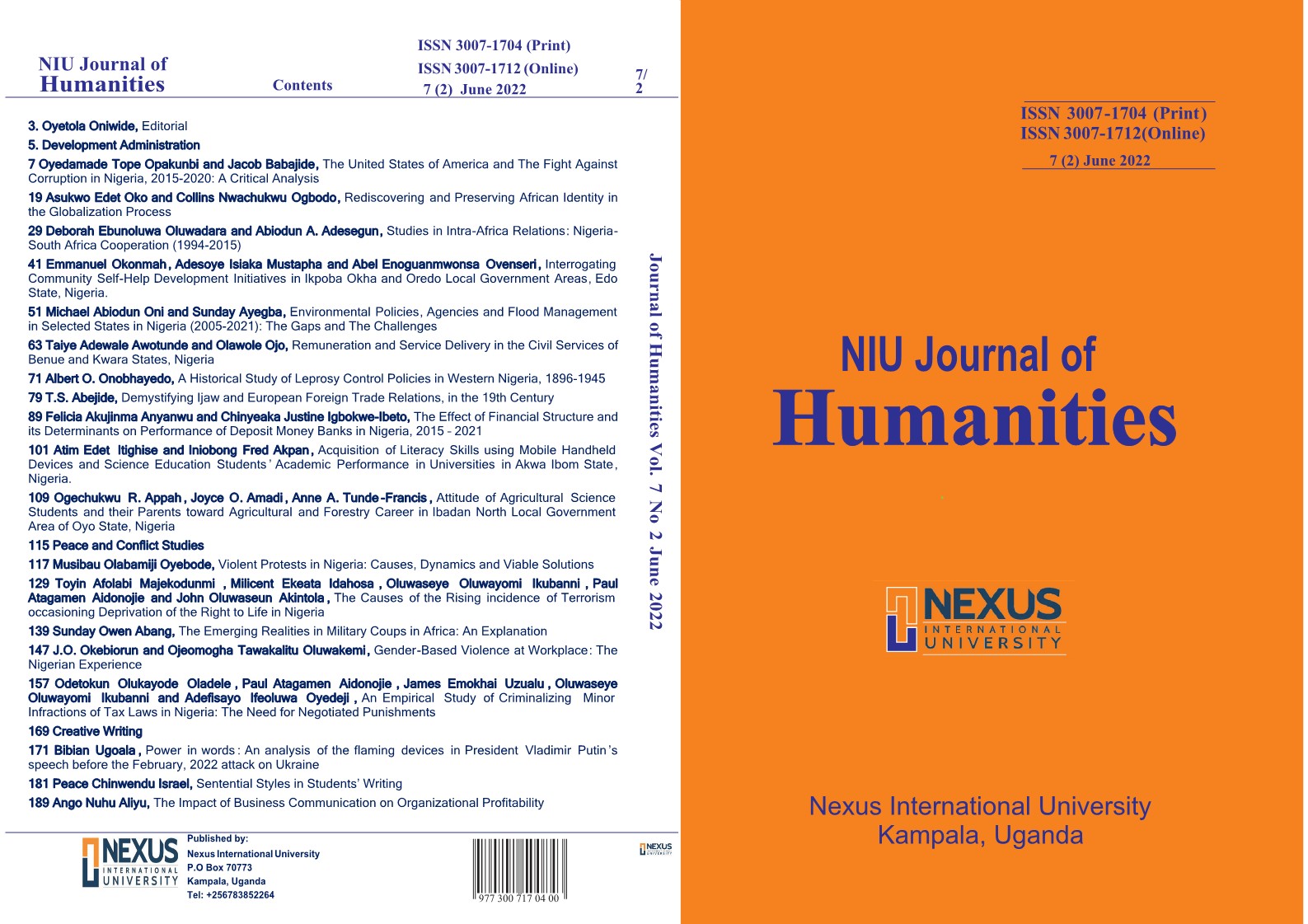 This issue of NIU Journal of Humanities touches on Development Administration, Creative Writing as well as Peace and Conflict Studies.