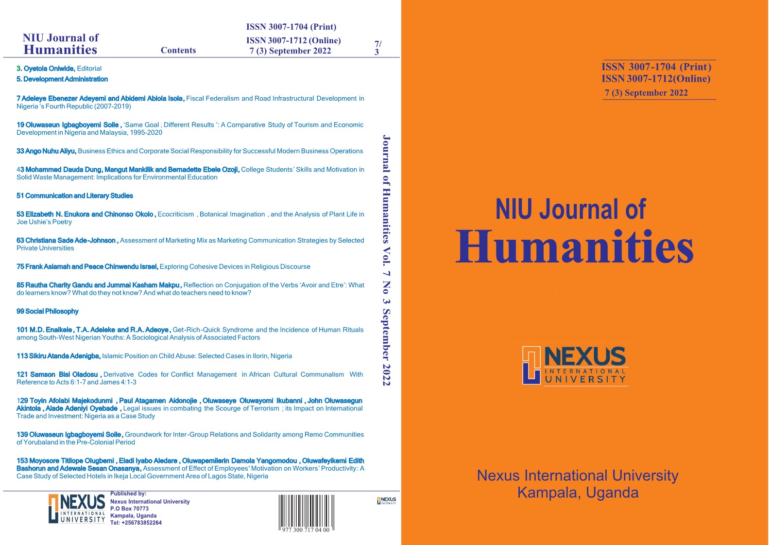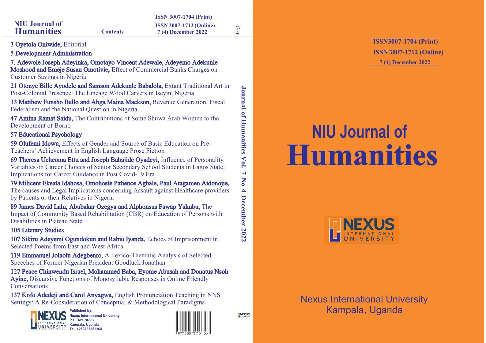 This issue of NIU Journal of Humanities touches on Development Administration, Social Philosophy as well as Communication and Literary Studies.