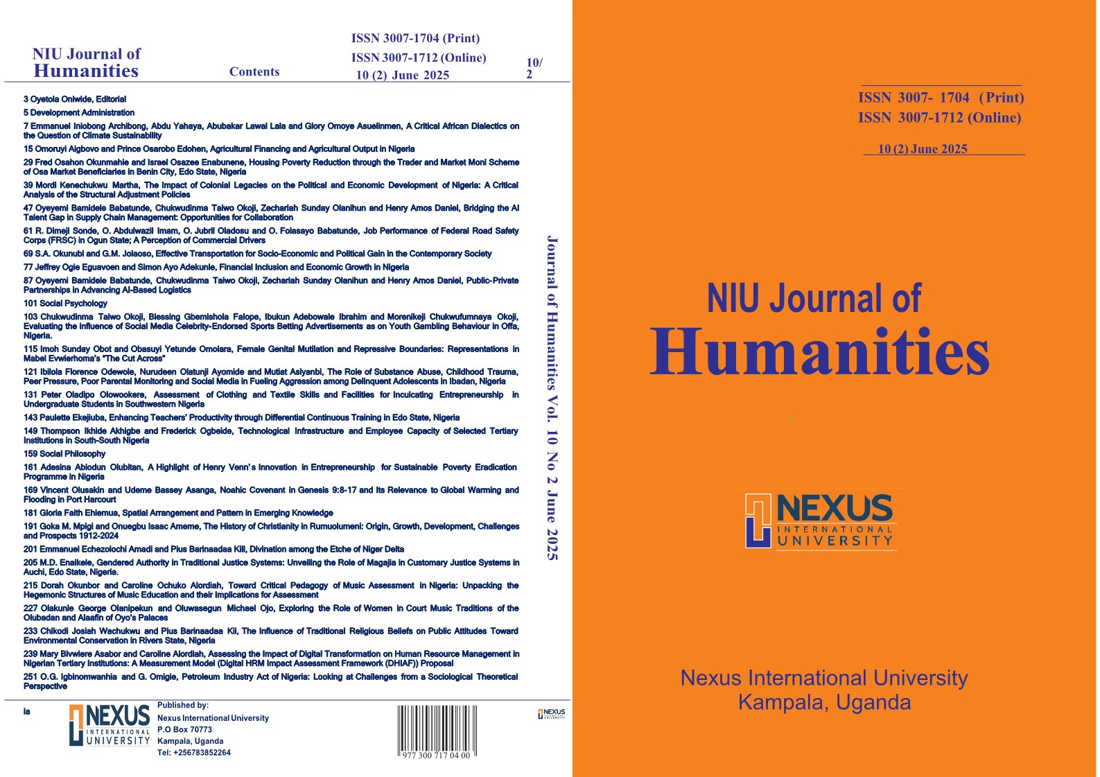 This edition of NIU Journal of Humanities touches on Youth Advocacy and Pedagogical Instructions, Impact of Orphanage-Based Interventions, Human Resource Management and Artistic Enterprise, Symbology, Identity, and Show as well as Business Paradigm in Contemporary Painting Space.
