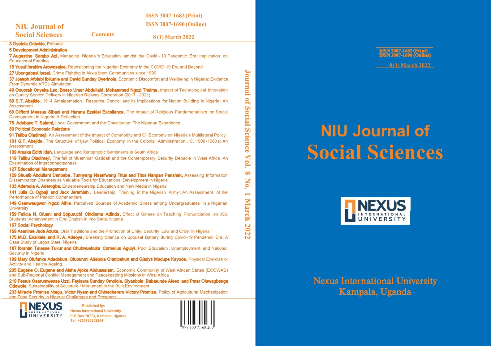 Vol 8 No 1 (2022)This issue of NIU Journal of Social Sciences focuses on Development Administration, Social Philosophy, Educational Management as well as Political Economic Relations.