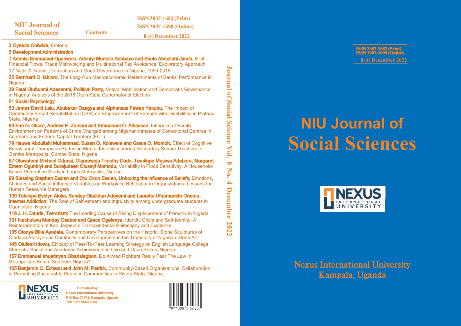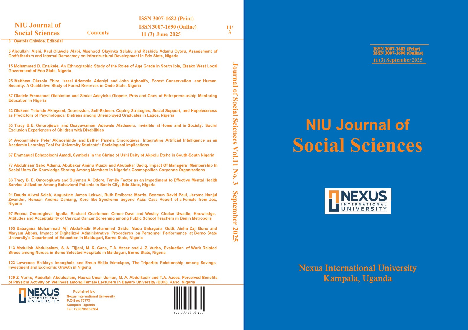 Vol 11 No 3 (2025)This edition of NIU Journal of Social Sciences focuses on Godfatherism, Ethnographic Study, Human Security, Entrepreneurship Mentoring Education, Psychological Distress as well as Effective Mental Health Service Utilization.